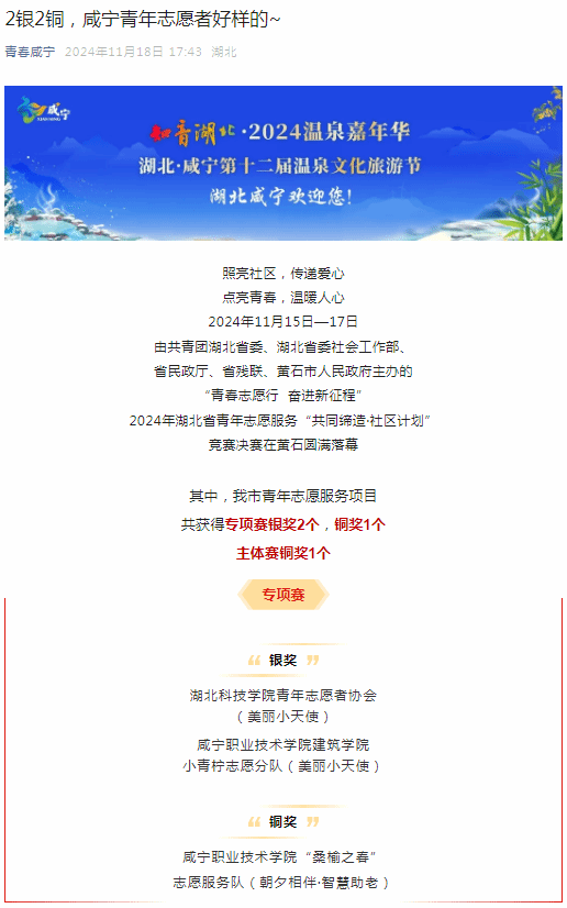 2021年和2024年,小青柠志愿服务队连续入选湖北省本禹志愿服务队,其志愿服务项目曾荣获咸宁市最佳志愿服务项目、湖北省青年志愿公益项目大赛铜奖等荣誉。这些成就不仅是对队员们辛勤付出的认可,也是对澳门网投十大信誉平台在大学生育人成长方面逐渐形成的常态化、长效化机制的肯定。