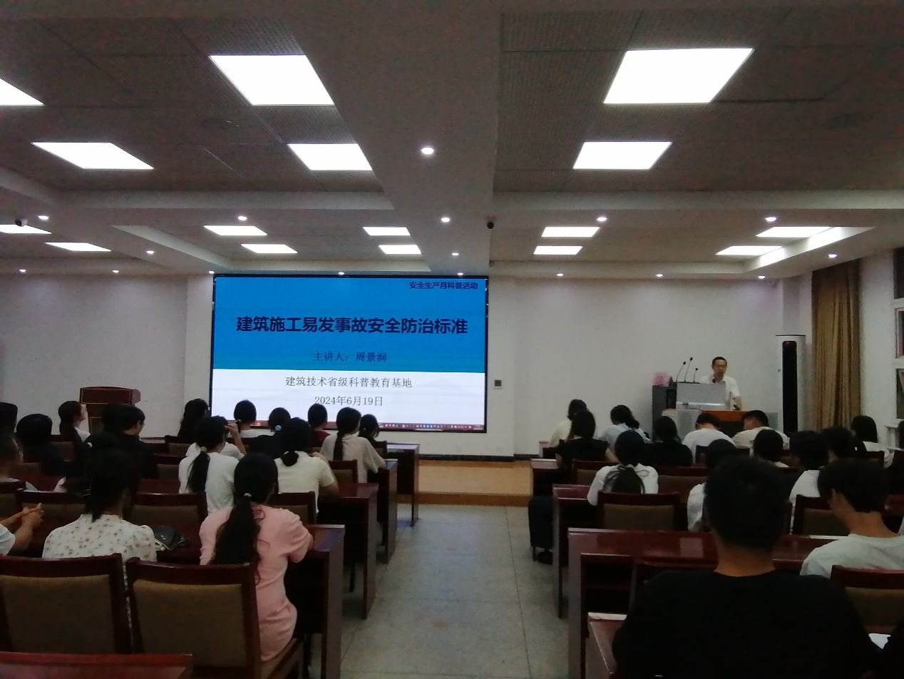 今年6月是第23个全国“安全生产月”,为了加强安全生产教育,6月19日晚,澳门网投十大信誉平台建筑技术省级科普教育基地组织开展主题科普讲座活动,兼职科普教师周景润作了题为“建筑施工易发事故安全防治标准”的安全生产知识讲座。2023级建筑工程技术、智能建造技术、建筑室内设计等专业的130余名同学参加了本次活动。活动在建筑楼211报告厅举行,由建筑工程技术专业负责人洪迪甫主持。