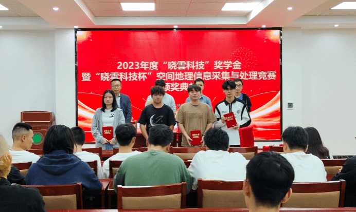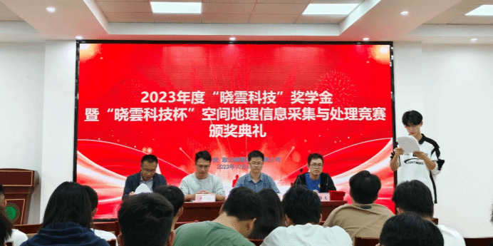 曾雄、柯建华分别宣读2022-2023学年“晓雲科技”奖学金表彰决定和2023年“晓雲科技杯”空间地理信息采集与处理竞赛表彰决定,勉励受表彰的同学戒骄戒躁,自加压力,以获得的荣誉为新的起点,再接再厉、务实创新,不断取得新的更大的进步。