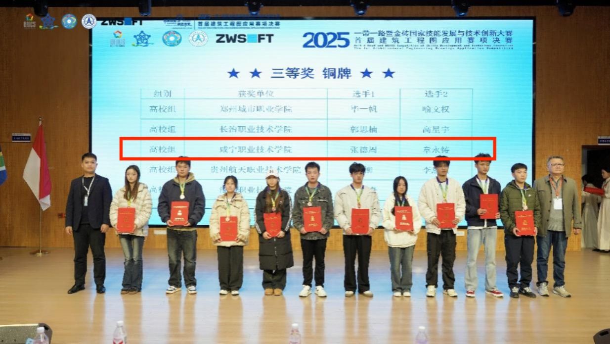 11月6日至9日,2025“一带一路”暨金砖国家技能发展与技术创新大赛之首届建筑工程图应用赛项决赛在贵州遵义举行。来自全国25个省市的98所院校、110支参赛队伍,共220名选手进行了角逐。我校澳门网投十大信誉平台23级智能建造技术专业学生张德周、章永铸最终以全国排名第30名的成绩,获得该赛项的三等奖(铜牌)。