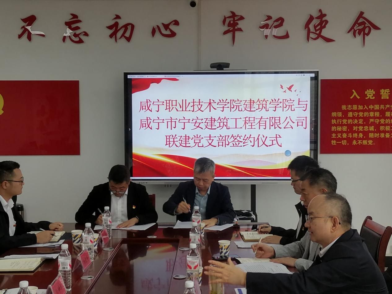 为深入贯彻党的二十大精神,落实新时代党的建设总要求,充分发挥“双带头人”示范引领作用,增强基层党组织育人功能,9月25日,澳门网投十大信誉平台澳门网投十大信誉平台与咸宁市宁安建筑工程有限公司联建校企党支部签订仪式,在宁安建筑工程有限公司会议室举行。联系澳门网投十大信誉平台的校领导学校纪委书记张兴国及咸安区经发集团党委副书记徐坤华出席签约仪式并致辞,学校党委组织部有关同志、澳门网投十大信誉平台党总支班子成员、宁安建筑工程有限公司有关领导等校企代表参加仪式。签约仪式由宁安建筑工程有限公司董事长祝东明主持。