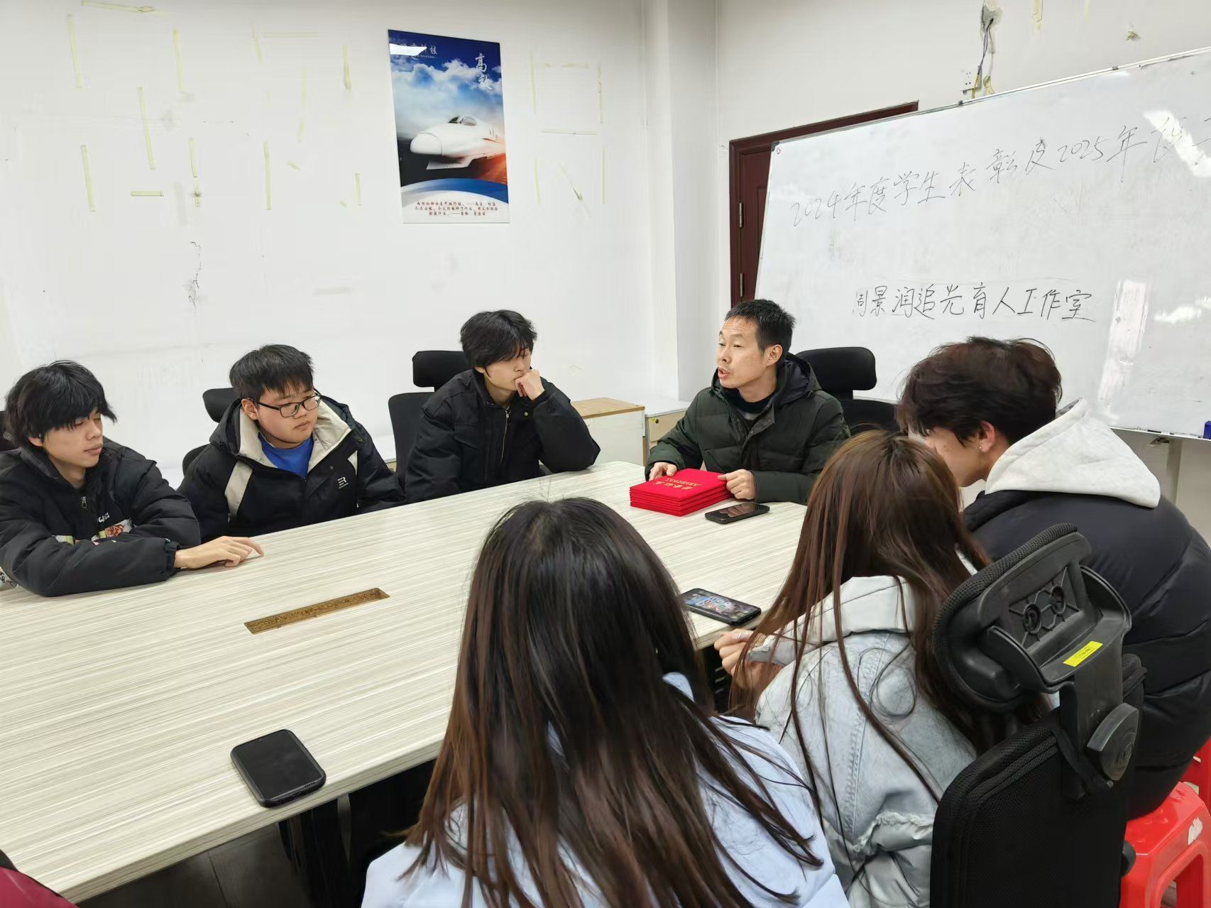 工作室负责人周景润老师为获奖学生颁发了荣誉证书和奖品,并对他们的努力和付出给予了高度肯定,鼓励他们在新的一年里继续保持,发挥模范带头作用。