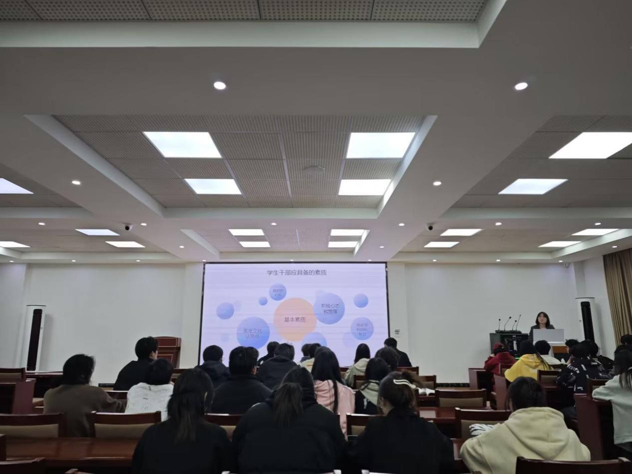 随后,辛凤儒同学围绕学生干部应具备的素质、礼仪、能力和工作方式四个方面,开展业务培训。他强调学生干部应具备的责任感、服务意识和专业素养,同时分享了高效沟通和团队协作的技巧,助力学生干部提升综合素质,更好地履行职责。