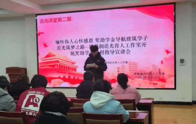 随着“太阳出来照四方,毛主席的思想闪金光……”,我们的追光讲堂在建筑大楼211报告厅徐徐拉开帷幕。出席本期追光讲堂的领导老师有周景润追光育人工作室主要组织者澳门网投十大信誉平台党总支副书记郭燕、学生党支部副书记周景润讲师、2023级带班辅导员以及全体2023级奖助学金获得学生。