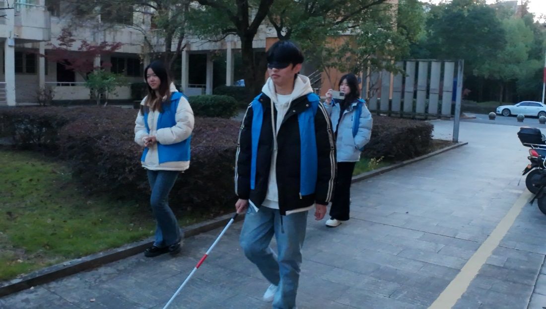 验收当日,融合育人场变身为沉浸式“研学”课堂。来自各学院的数十名学生通过佩戴眼罩、使用盲杖、乘坐轮椅,亲身体验“熄屏打字”“蒙眼寻咖”和校园出行。当黑暗中响起周景润老师与轮椅少年小帅合奏的古筝曲时,许多同学深受触动。
