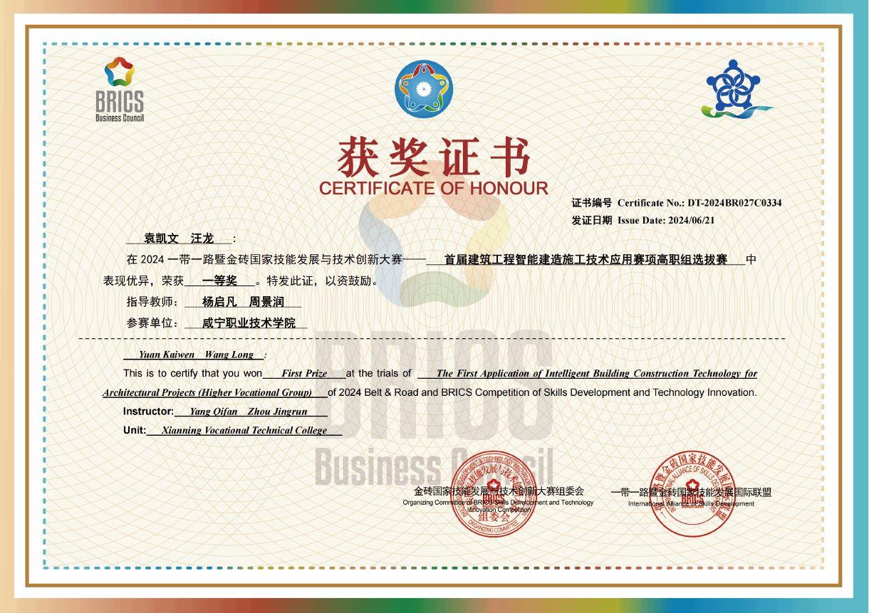 金砖国家技能发展与技术创新大赛首届建筑工程智能建造技术应用赛项区域赛一等奖
